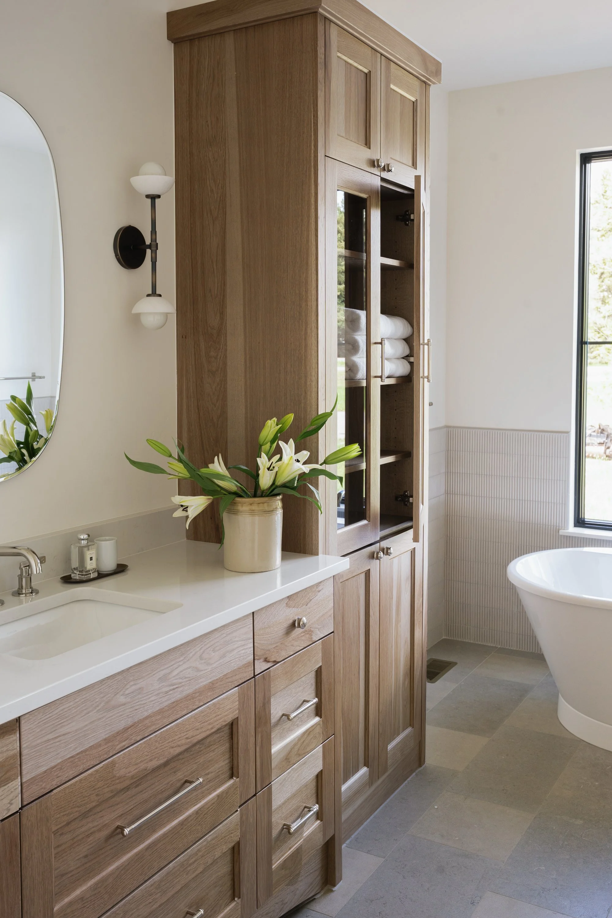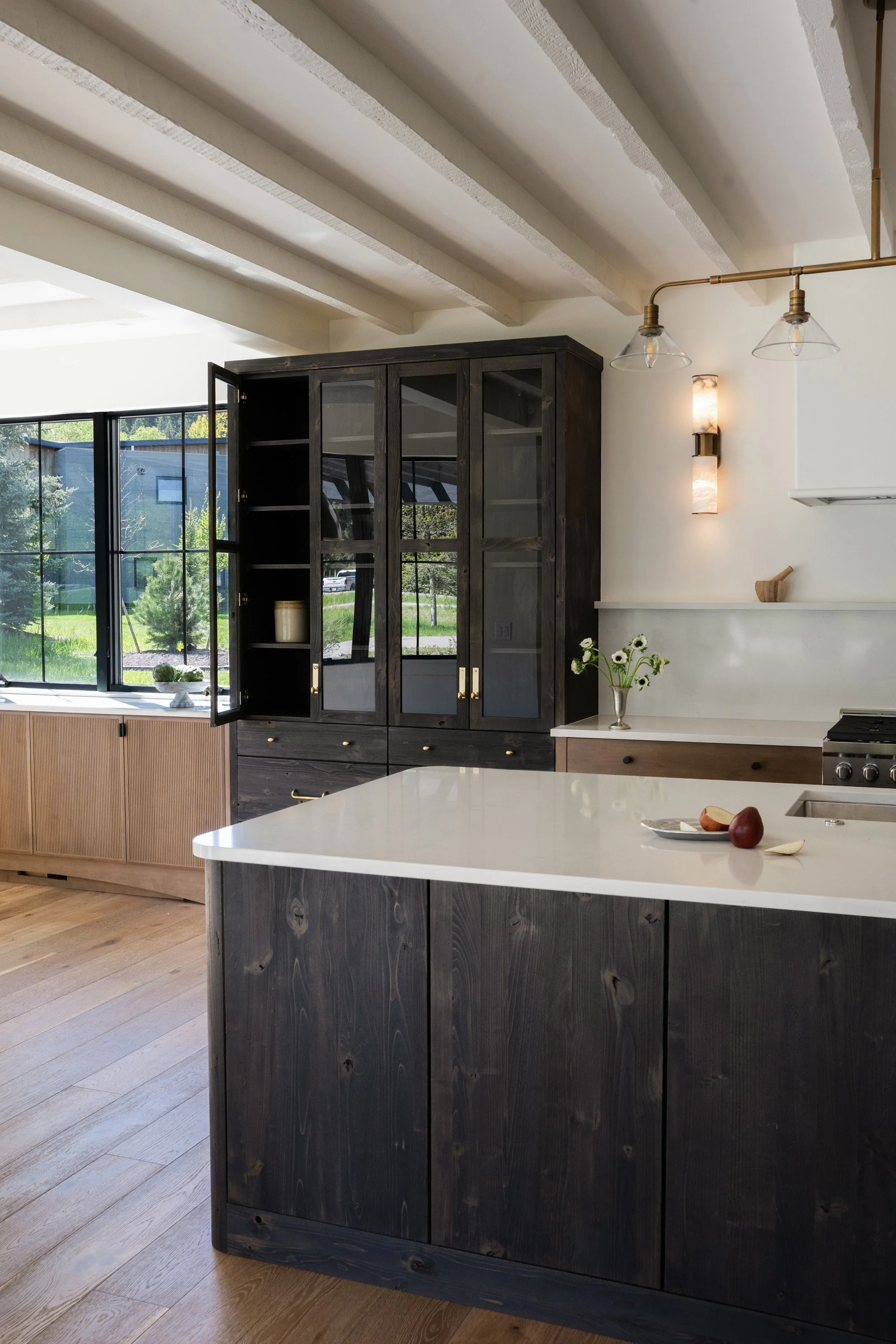 Custom-designed cabinetry featuring distinctive wood species with unique knot patterns in each room
